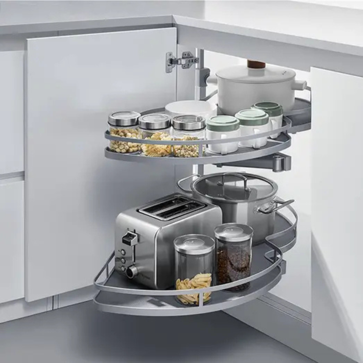 The Magic Corner Unit efficiently utilizes corner space with a smooth, soft-close pull-out system. Made from durable, corrosion-resistant steel, it offers easy access, high load capacity, and elegant functionality—a perfect fit for modern modular kitchens.